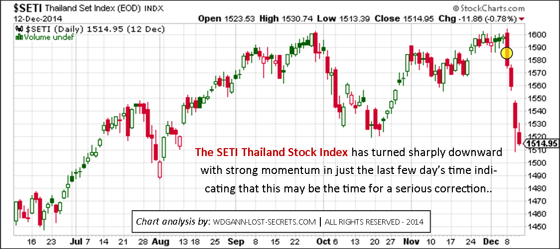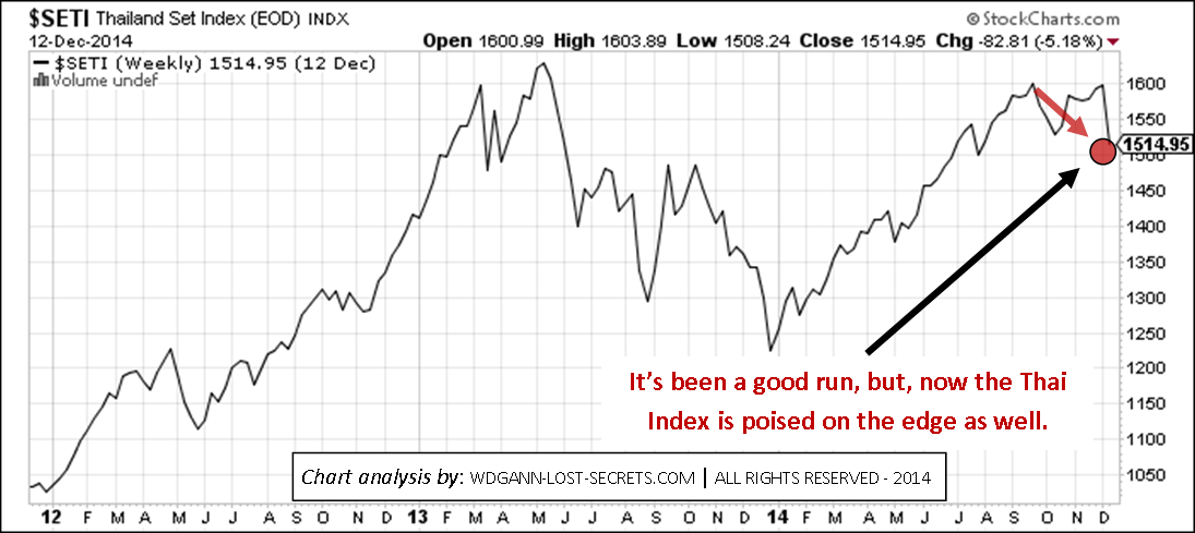 Alas, that sand-in-the-gearworks I wrote of earlier has begun to make itself visible in the Thai market now. When you look at the chart, you can almost hear the grinding and slowing down of the ‘gears’ to this index. If you listen closely enough, you may find that they have stopped and are starting to reverse a little.