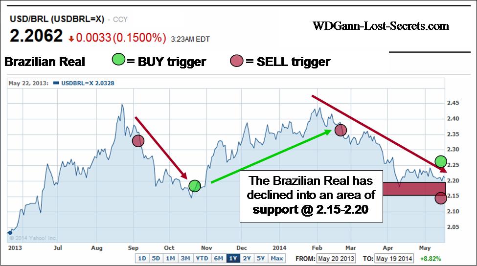 If prices drop to the lower red circle area, then support has failed and a renewed downward movement is highly likely which could drive the REAL to declines of .20-.25.