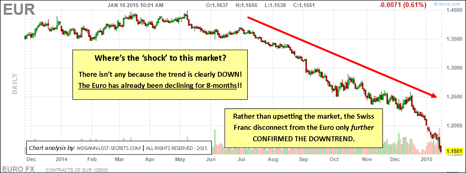 Most who were hurt from the Swiss Franc were depending on it for stability. However, once it became pegged to another currency, the SF became dependent on non-Swiss economic policies and decisions. In short, conditions for their own currency were subject to forces outside of Switzerland. This altered the former stability of the Swiss Franc to something fated to fail in the long-run. - A quick look at a price chart for the weekly & monthly price levels of the Euro reveals the real trend showing why action had to be taken by the Swiss while there was still time.