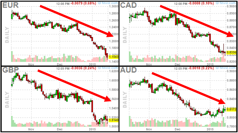 - First, it’s clear that commodity prices are still in decline from their 2011 peak of the cycle (the weak Currencies should now be considered as part of this Commodity Trend). Therefore, one should NOT be taking Long positions in a declining weekly or monthly market. The Swiss Franc situation was unique in that it was a strong currency that was pegged to another weakening currency (the Euro). When released, it compensated for lost time and value by springing upwards by over 20% at one point.