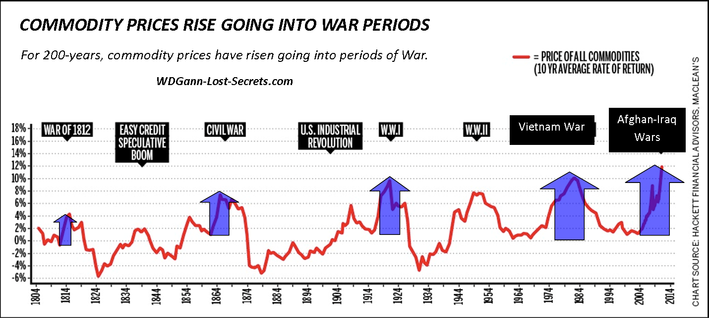 The Cycles of War and Prosperity are just two of these arenas. Though talk of war is unseemly at this time of the year, even Mr. Gann called attention to the fact that these very war periods brought about rising commodity prices and were strong drivers of markets.