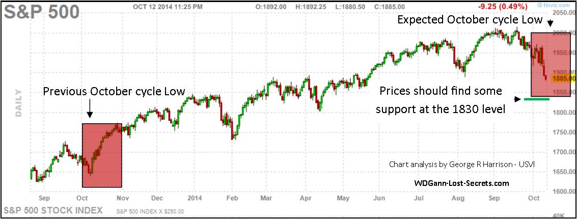 There is an expected S&P 500 October market slide bottom that is acting out on cue at present. If you look at the S&P 500 chart below you’ll see a green horizontal line on the chart. This represents where we can expect to find some price support or slowing of the decline should it continue downwards.