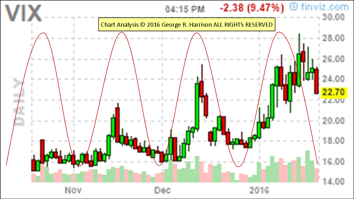 The Volatility of the stock market has a methodical swing cycle lately of about two-weeks from one extreme to the other and, though they don’t always align with peaks or troughs, they do tend to stop ongoing micro-trends in their tracks and reverse trend direction on the short-term.