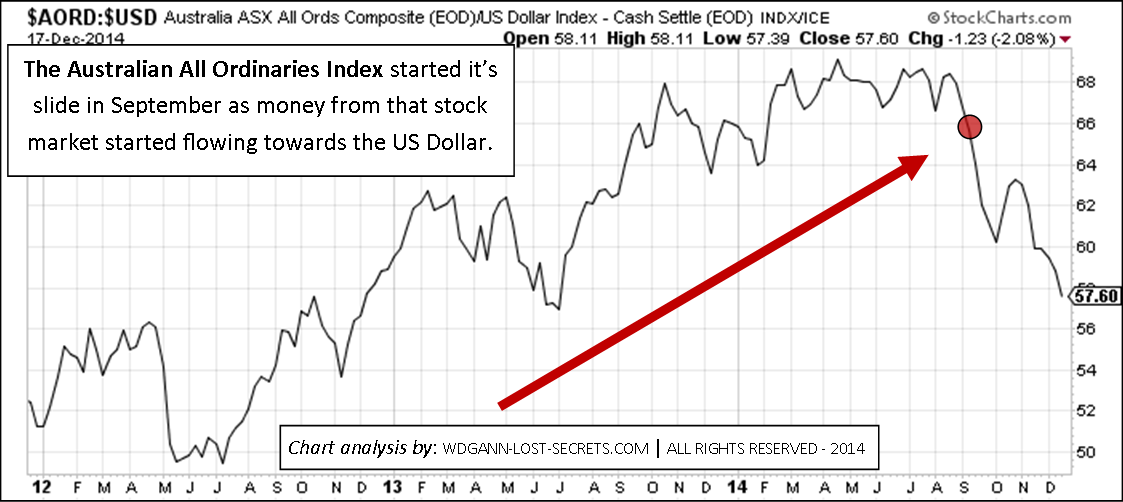 On the other side of the World, as represented by Australia, we see the same loss of value and shift towards the US Dollar from the All Ordinaries Index: