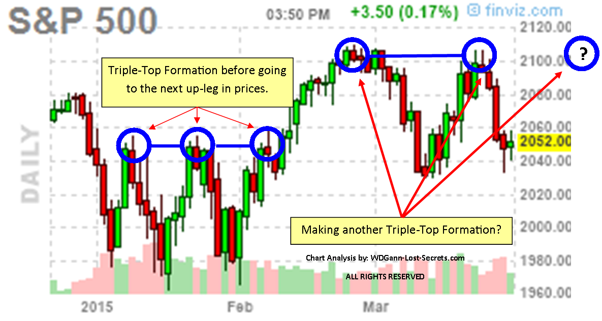 As you can see on the chart to the left, the last triple-top formation preceded a big break-out in prices to the upside.