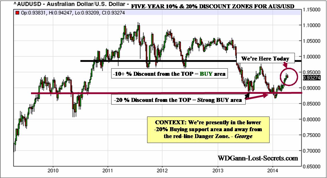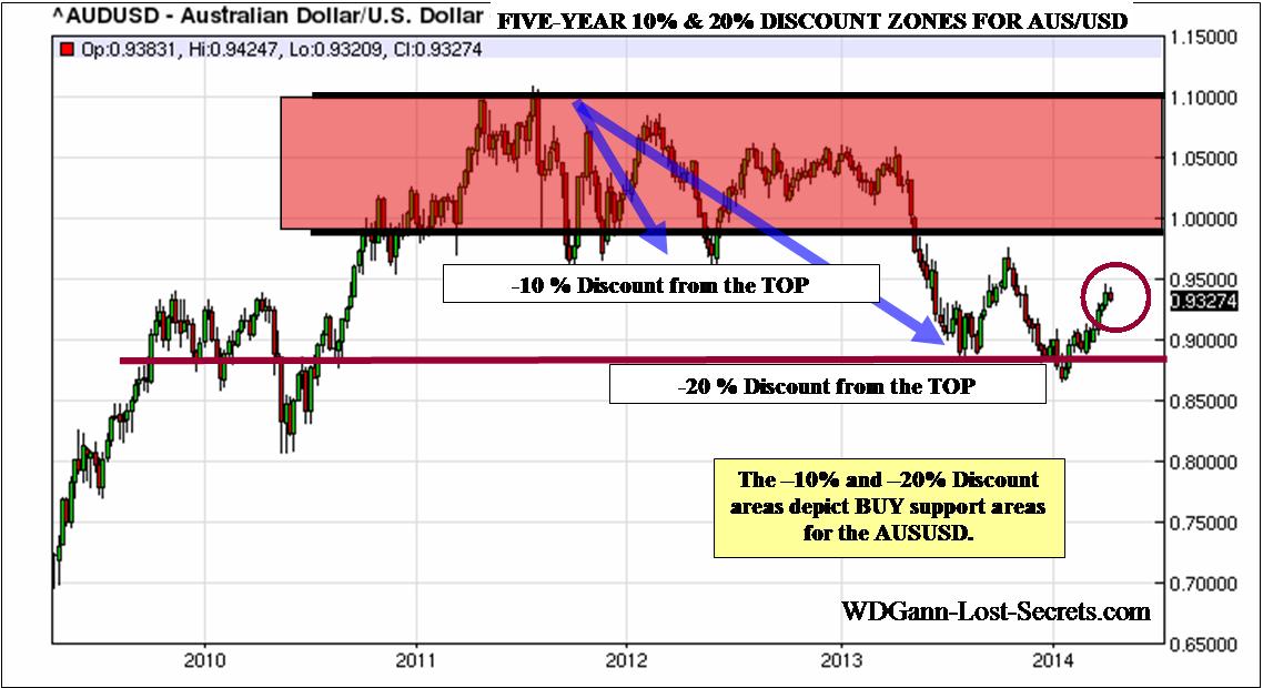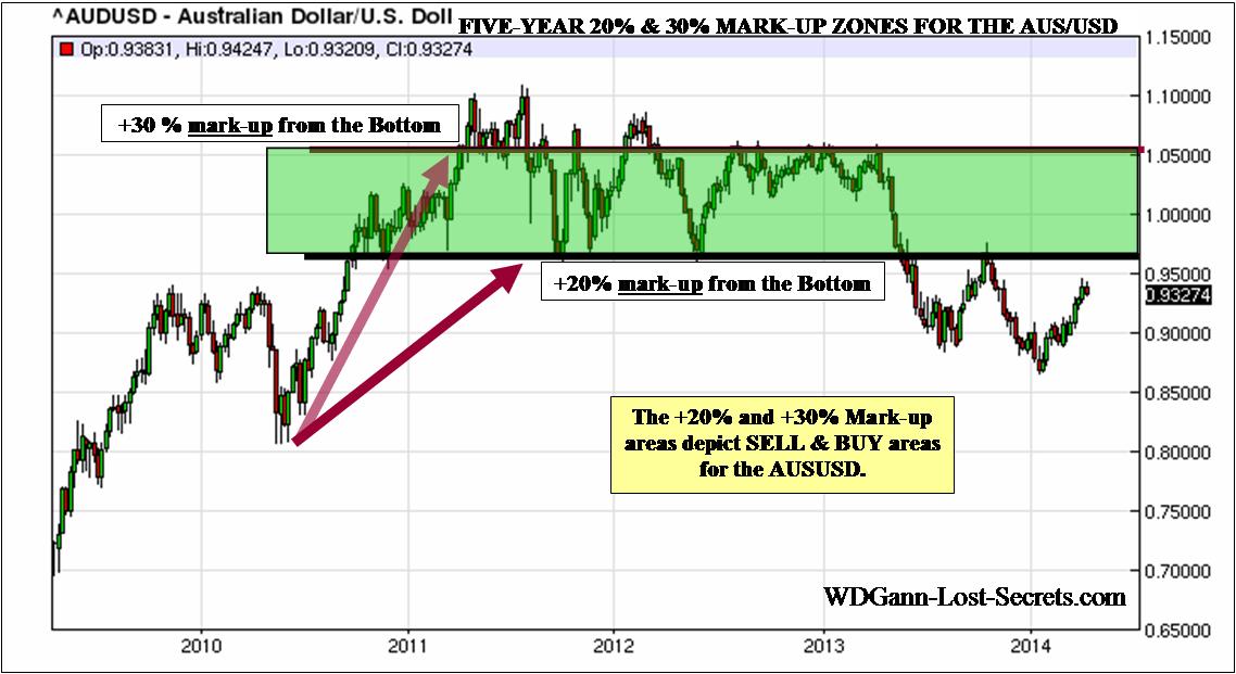If we examine the activity of the last 5-Years, we find that the Australian Dollar market provided +20% and +30% Mark-ups from the Lows and provided additional -10% and -20% downside profit potentials on the Discounts from the tops.