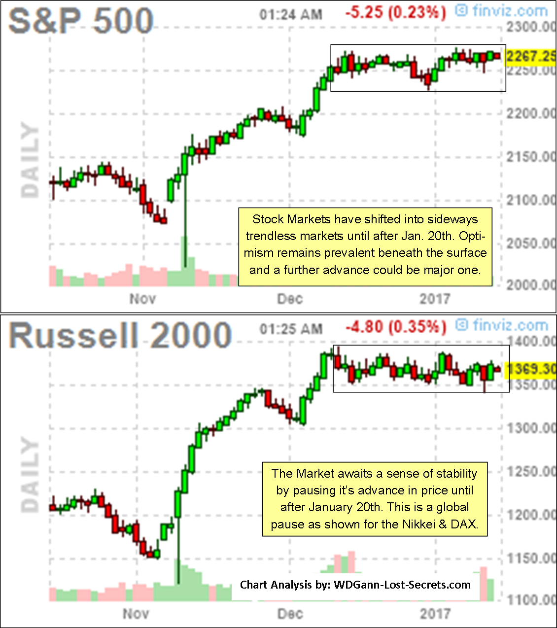 Whether the market breadth is for 30 stocks (the Dow), 500 stocks (the S&P 500 index) or the larger 2000 company group represented by the Russell 2000, we see the same action displayed: A consolidation or sideways trend is in process following our recent strong upswing in prices.