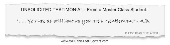 For many years now, it's been my privilege to possess a set of 'Keys' to unlocking and interpreting Mr. W.D. Gann's personal writings & price charts. These 'Keys' have led to remarkable re-discoveries and explanations which have truly opened up the mysteries of W.D. Gann's writings and have led to a greater understanding of his extensive private and public works. These new discoveries have only enlarged the already great admiration of Mr. Gann's achievements by countless traders around the World.