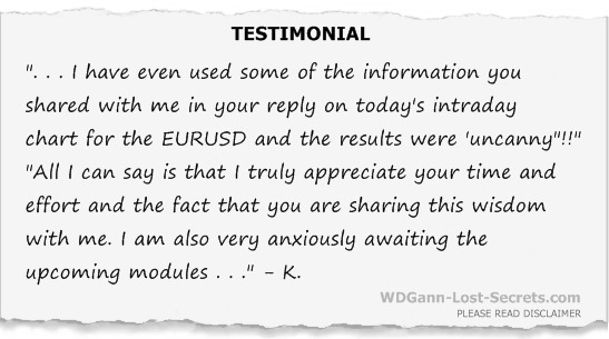 After a thorough examination and study of the papers obtained, I'll provide to you, as an elite Member of 'The Inner Circle of 12', a report with details of the decoded techniques discovered and how they work together with Mr. Gann's other works to make up a holistic approach to further understand his approach to Trading.
