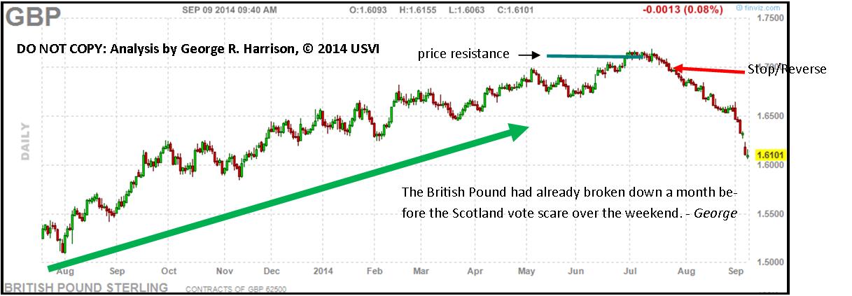 While the World only came to this conclusion over the weekend (with the shock about the Scottish Independence vote going against England), the best positioning was back several weeks ago to take advantage of the slide to come. As is usually the case, there was no news back then to offer a clue.