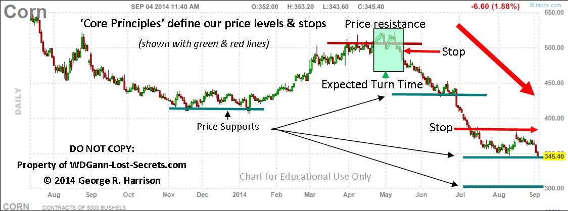 This new addition to the private portion of our website is introduced for the benefit of those who wish to view today’s markets in the light of these latest discoveries and the market’s natural laws as did WD Gann. The example chart above shows how these component ‘core principles’ work when applied to the CORN market.